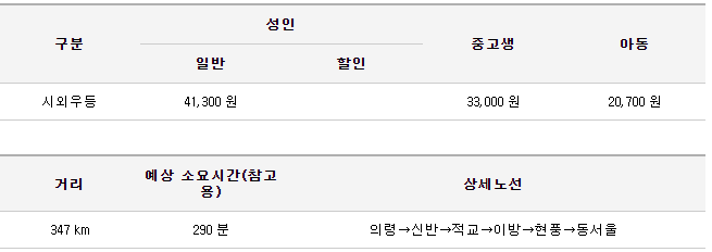의령에서 동서울 터미널 가는 버스는 첫차 7시 35분, 막차 15시 30분에 운행되고 있으며 일반 버스 기준으로 41,300원의 요금을 받고 있습니다.