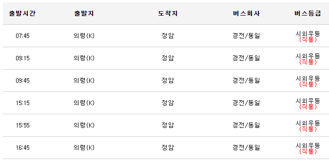 의령에서 정암 가는 시외버스 시간표