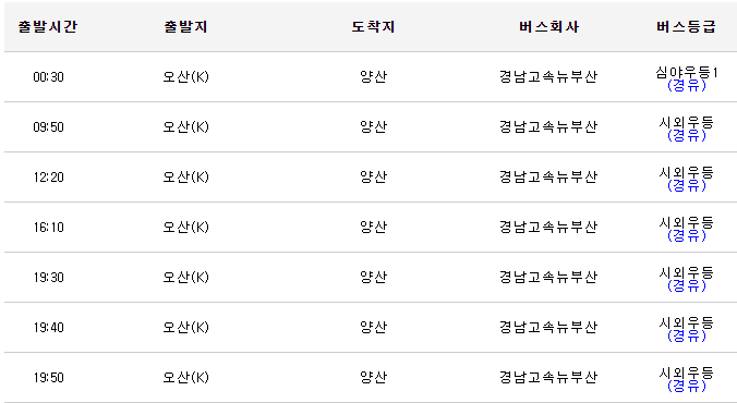 오산에서 양산 가는 버스는 첫차 0시 30분, 막차 19시 50분에 운행되고 있으며 우등 버스 기준으로 37,900원의 요금을 받고 있습니다.