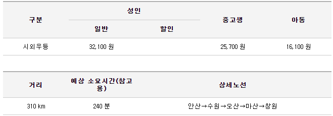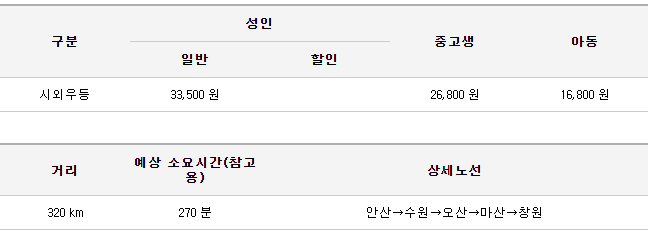 오산에서 창원 가는 버스는 첫차 0시 50분, 막차 20시 30분에 운행되고 있으며 우등 버스 기준으로 33,500원의 요금을 받고 있습니다.