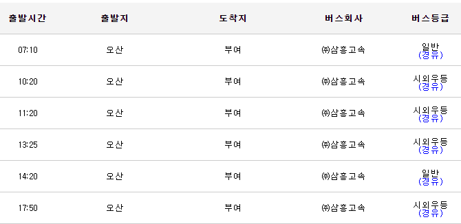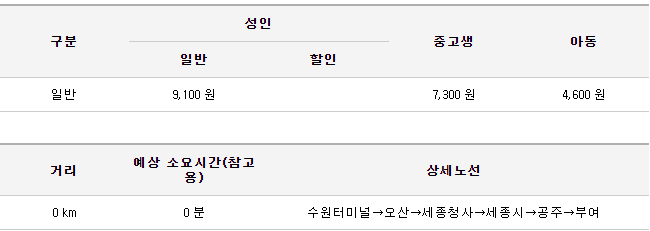 오산에서 부여 가는 버스는 첫차 7시 10분, 막차 17시 50분에 운행되고 있으며 일반 버스 기준으로 15,100원의 요금을 받고 있습니다.