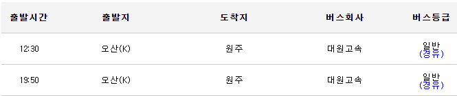 오산에서 원주 가는 버스는 첫차 12시 30분, 막차 19시 50분에 운행되고 있으며 일반 버스 기준으로 9,200원의 요금을 받고 있습니다.