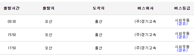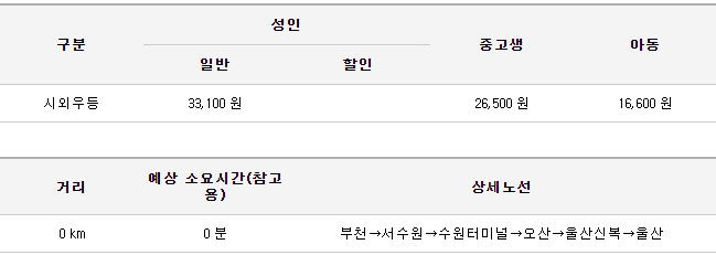 오산에서 울산 가는 버스는 첫차 9시 30분, 막차 17시 50분에 운행되고 있으며 우등 버스 기준으로 33,100원의 요금을 받고 있습니다.