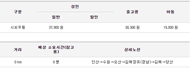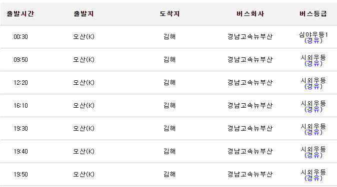 오산에서 김해 가는 버스는 첫차 0시 30분, 막차 19시 50분에 운행되고 있으며 우등 버스 기준으로 34,700원의 요금을 받고 있습니다.