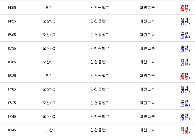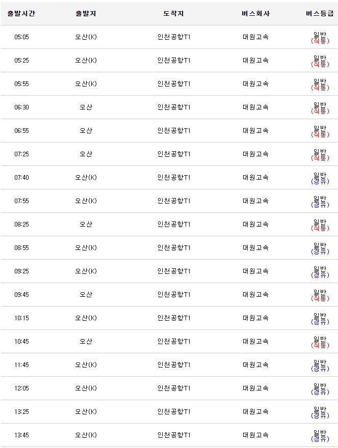 오산에서 인천공항 가는 버스는 첫차 5시 5분, 막차 18시 45분에 운행되고 있으며 일반 버스 기준으로 12,400원의 요금을 받고 있습니다.