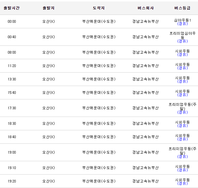 오산에서 부산 해운대 가는 버스는 첫차 0시, 막차 19시 20분에 운행되고 있으며 우등 버스 기준으로 37,100원의 요금을 받고 있습니다.