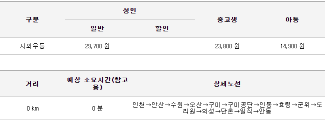 오산에서 의성 가는 버스는 첫차 10시 30분, 막차 17시 50분에 운행되고 있으며 일반 버스 기준으로 29,700원의 요금을 받고 있습니다.