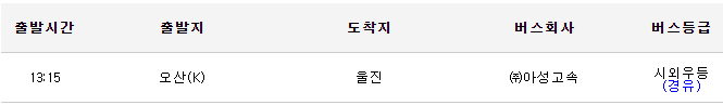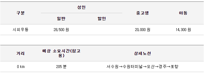 오산에서 경주 가는 버스는 첫차 10시 50분, 막차 13시 15분에 운행되고 있으며 우등 버스 기준으로 28,500원의 요금을 받고 있습니다.