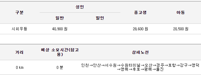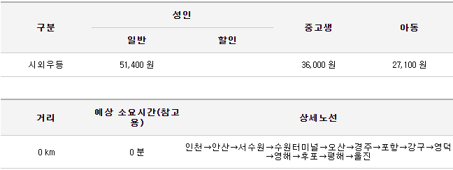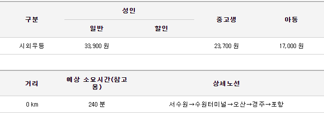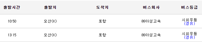 오산에서 포항 가는 버스는 첫차 10시 50분, 막차 13시 15분에 운행되고 있으며 우등 버스 기준으로 33,900원의 요금을 받고 있습니다.