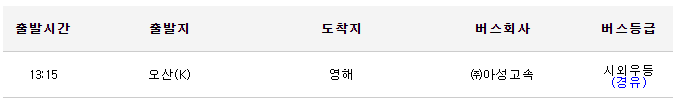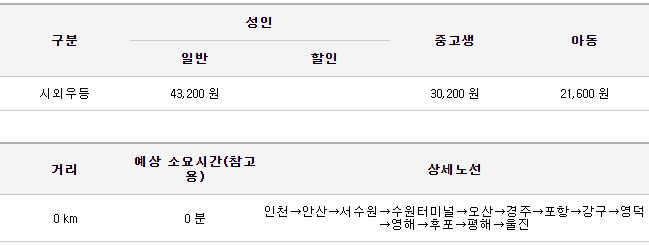 오산에서 영해 가는 버스는 13시 15분에 운행되고 있으며 우등 버스 기준으로 43,200원의 요금을 받고 있습니다.