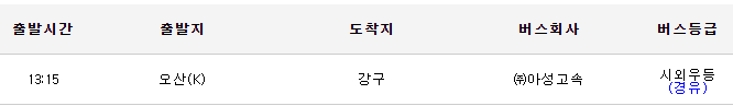 오산에서 강구 가는 버스는 13시 15분에 운행되고 있으며 우등 버스 기준으로 39,900원의 요금을 받고 있습니다.