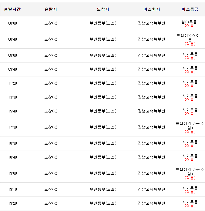 오산에서 부산 동부 터미널 노포 가는 시외버스 시간표