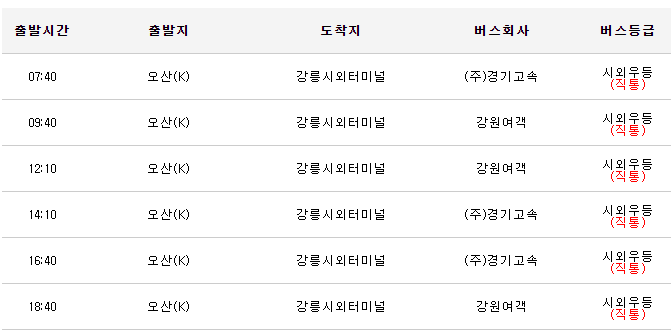 오산에서 강릉 가는 버스는 첫차 7시 40분, 막차 18시 40분에 운행되고 있으며 우등 버스 기준으로 22,400원의 요금을 받고 있습니다.