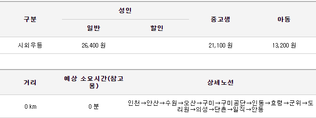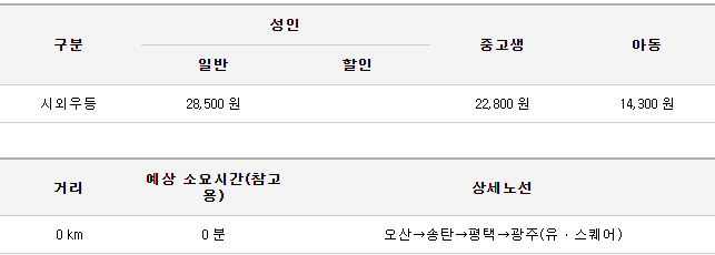 오산에서 광주 가는 버스는 첫차 8시, 막차 17시에 운행되고 있으며 우등 버스 기준으로 28,500원의 요금을 받고 있습니다.