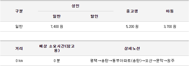 오산에서 문막 가는 버스는 첫차 12시 30분, 막차 19시 50분에 운행되고 있으며 일반 버스 기준으로 7,400원의 요금을 받고 있습니다.