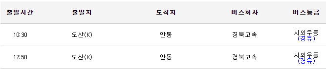 오산에서 안동 가는 버스는 첫차 10시 10분, 막차 17시 50분에 운행되고 있으며 우등 버스 기준으로 32,100원의 요금을 받고 있습니다.