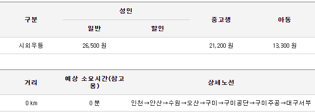 오산에서 대구 서부 정류장 가는 버스는 첫차 8시 30분, 막차 15시 10분에 운행되고 있으며 우등 버스 기준으로 26,500원의 요금을 받고 있습니다.