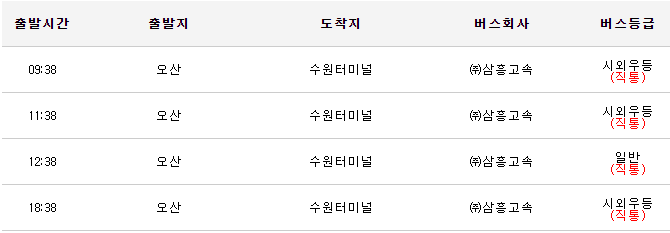 오산 시외버스 터미널 시간표 버스 운행 시간표