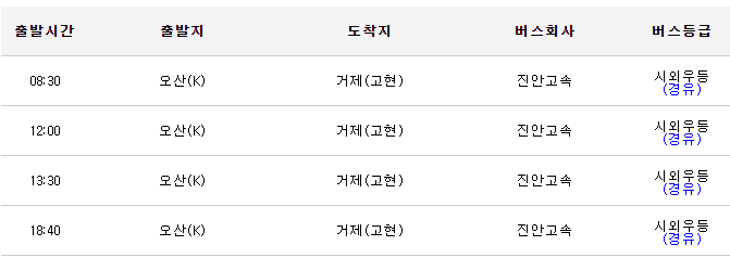 오산에서 거제 고현 가는 버스는 첫차 8시 30분, 막차 18시 40분에 운행되고 있으며 우등 버스 기준으로 37,600원의 요금을 받고 있습니다.