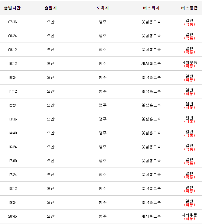 오산에서 청주 가는 버스는 첫차 7시 36분, 막차 20시 45분에 운행되고 있으며 일반 버스 기준으로 6,900원의 요금을 받고 있습니다.