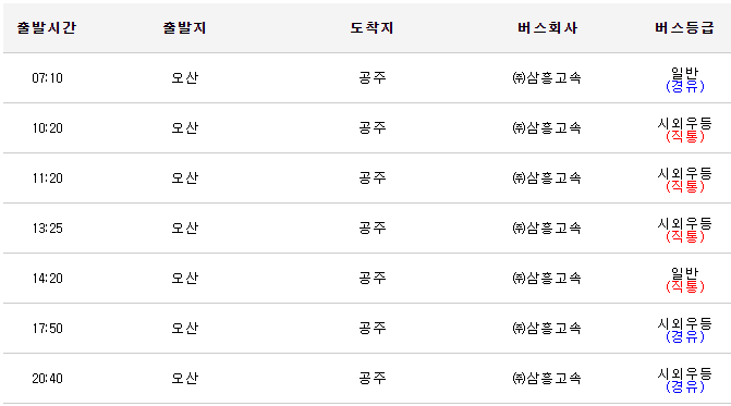 오산에서 공주 가는 버스는 첫차 7시 10분, 막차 20시 40분에 운행되고 있으며 일반 버스 기준으로 9,700원의 요금을 받고 있습니다.