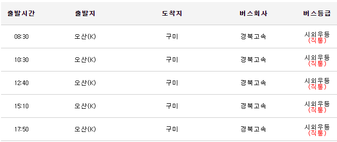오산에서 구미 가는 버스는 첫차 8시 30분, 막차 17시 50분에 운행되고 있으며 우등 버스 기준으로 20,500원의 요금을 받고 있습니다.