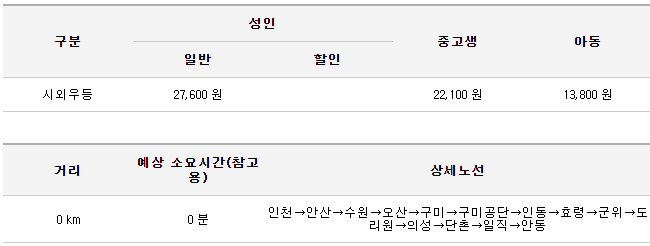 오산에서 도리원 가는 버스는 첫차 10시 30분, 막차 17시 50분에 운행되고 있으며 우등 버스 기준으로 27,600원의 요금을 받고 있습니다.