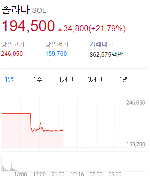 솔라나는 업비트에 상장될 때 159,700원으로 거래가 시작되었는데 지금은 무려 22% 가량 가격이 상승해서 195,200원에 거래되고 있습니다. 가상화폐에 이렇게 한 번 가격 급등의 불이 붙으면 언제까지 상승세를 이어갈지 그리고 얼마나 큰 폭으로 상승할지 아무도 쉽게 예측할 수가 없어서 무서운 것 같습니다.