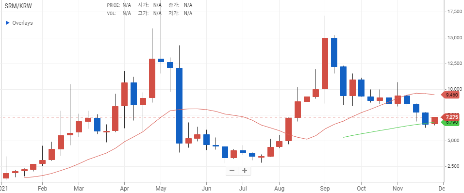 세럼 코인의 가격은 현재 약 7,270원에 거래되고 있으며 지난 9월 17,000원 이상으로 가격이 급등한 이후로 계속 가격이 크게 떨어지고 있는 상황입니다. 코인마켓캡에서의 전체 가상화폐 시가총액 순위로는 127위에 올라 있으며 업비트에서의 가상화폐 시가총액 순위로는 71위에 자리하고 있습니다.